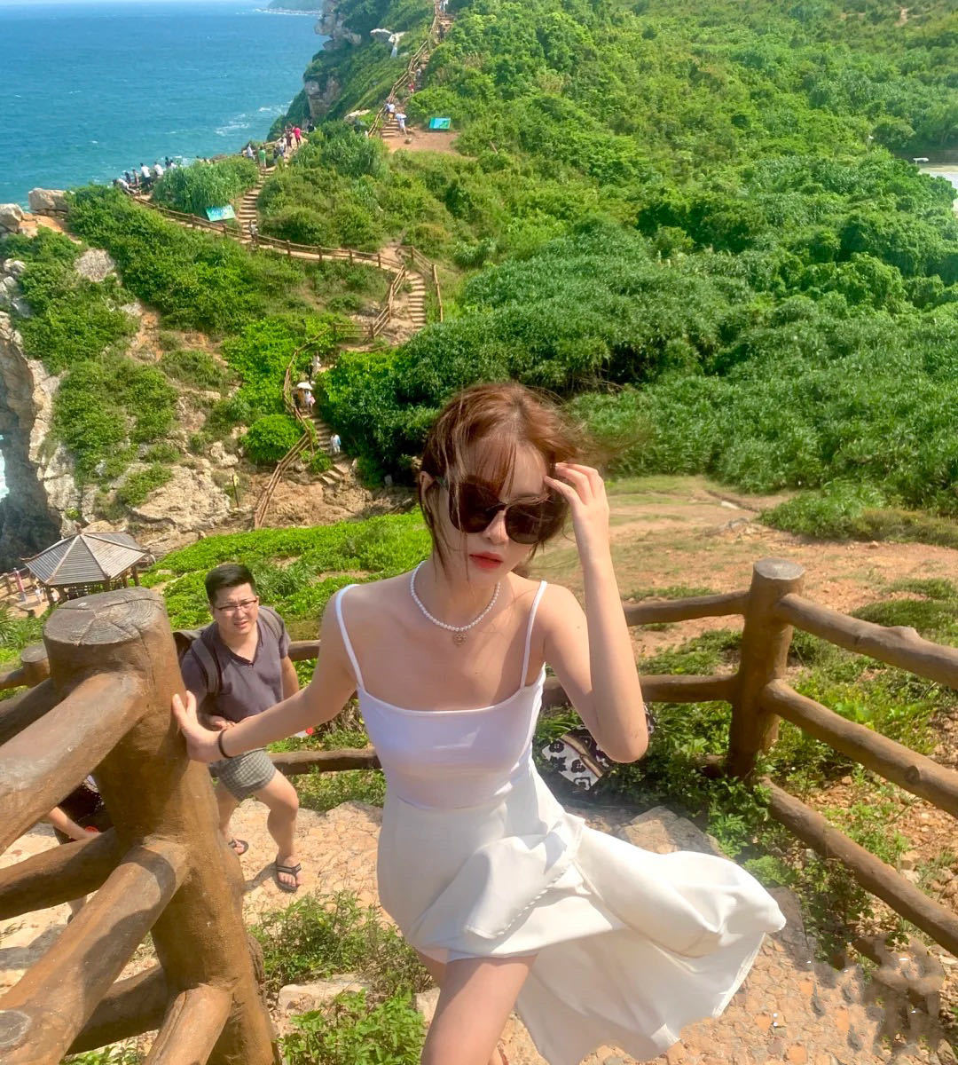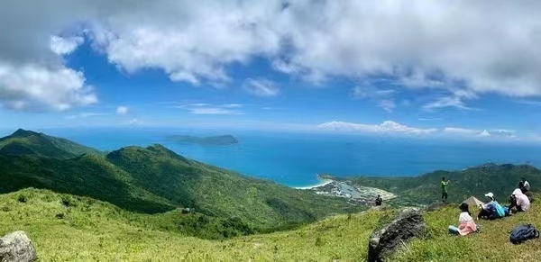 13:00午餐过后开始沿着鹿雁科考线登山道登山。从鹿嘴山庄出发,沿着石阶向上,穿越密林直达山顶。山顶两侧是大海、远处飘浮的小岛、天空的白云景色美极了。