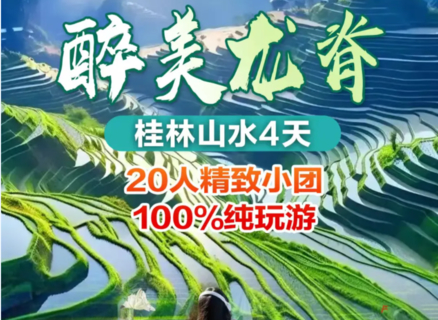 20人以内精致小团,同频同维一起同游, 住800米高吊脚楼景观房,品壮家“咩嫚®”秘制山珍火堂围炉宴。桂林-阳朔-龙脊各住一晚,让情绪达到嗨点。灌水后龙脊梯田,美如天空之镜,山间云雾缭绕,宛如一幅水墨画卷。龙脊起于梯田,不止于梯田,还有吊脚楼建筑群,淄博烧烤的烟火气...... 高海拔的山寨,清风徐来,是一个睡觉的好地方,在这里没有车马声,没有光污染,只有宁静的星空与青蛙知了鸟儿的叫声,以及清晨公鸡的打鸣。画重点:升级一晚龙脊吊脚楼的景观房(独家指定房号,海拔800米以上,越过屋顶看风景),我们是深度游,与走马观花当天往返的龙脊一日游划清界线,这里有民族风、烟火气,人情味。更有双特色晚宴等你品尝,在龙脊平安寨网红巷“竹筒咩嫚”阿婆家享用80标壮家“咩嫚®”秘制山珍火堂围炉宴。参加话龙脊,品龙脊,阅龙脊3大主题体验活动,“竹筒咩嫚”为主厨世家注册商标,请认准原创商标,谨防假冒!!!