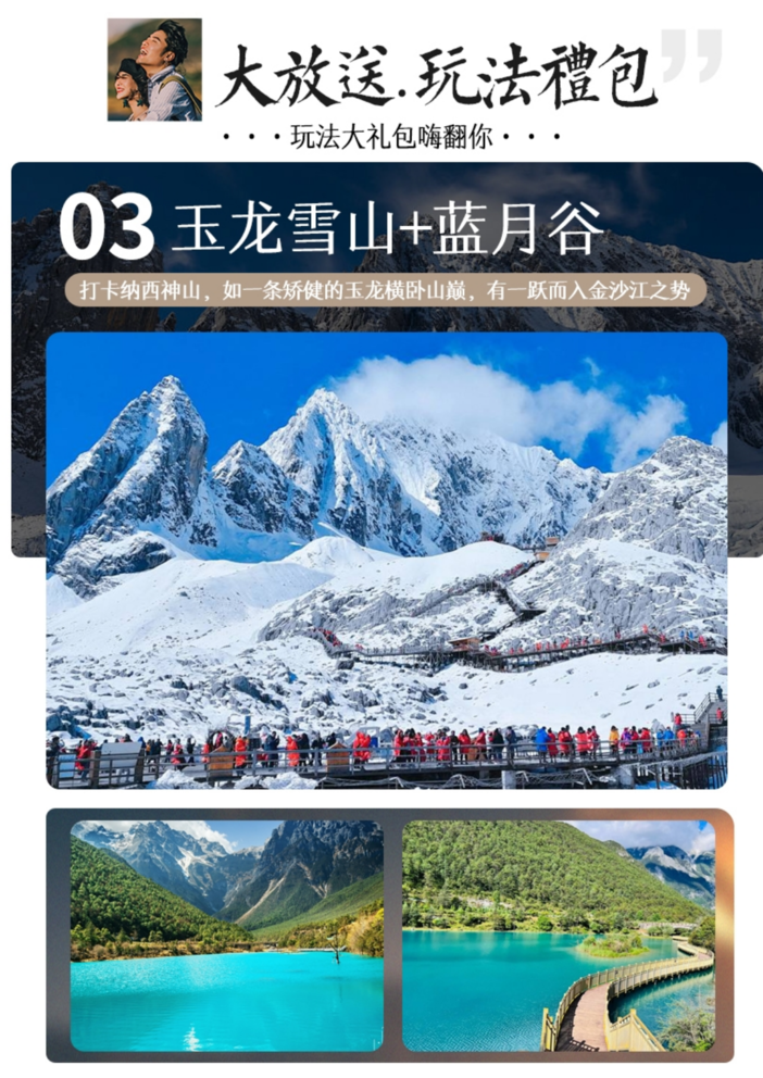 ▶ 大理古城→玉龙雪山/云杉坪索道→蓝月谷→印象丽江/丽水金沙—丽江古城