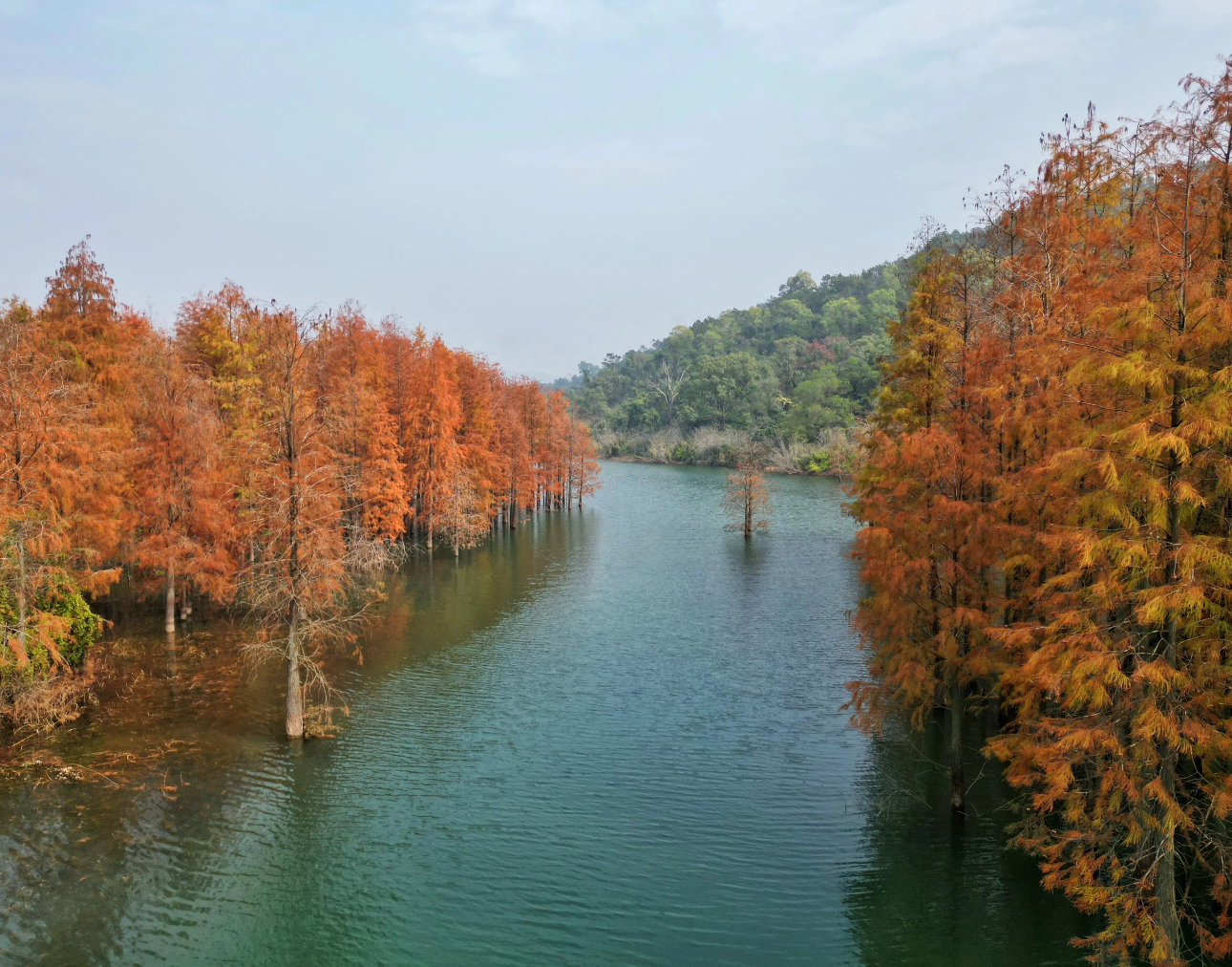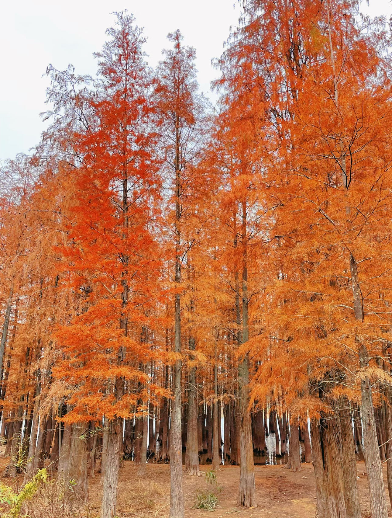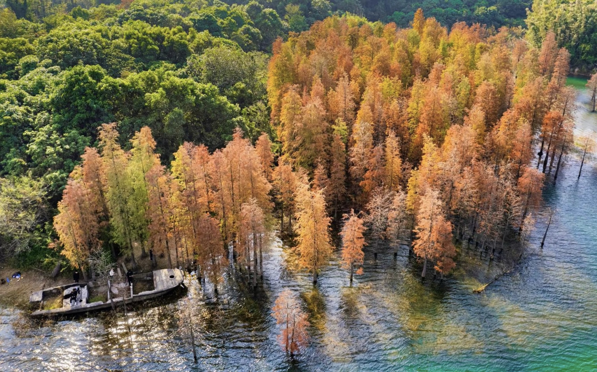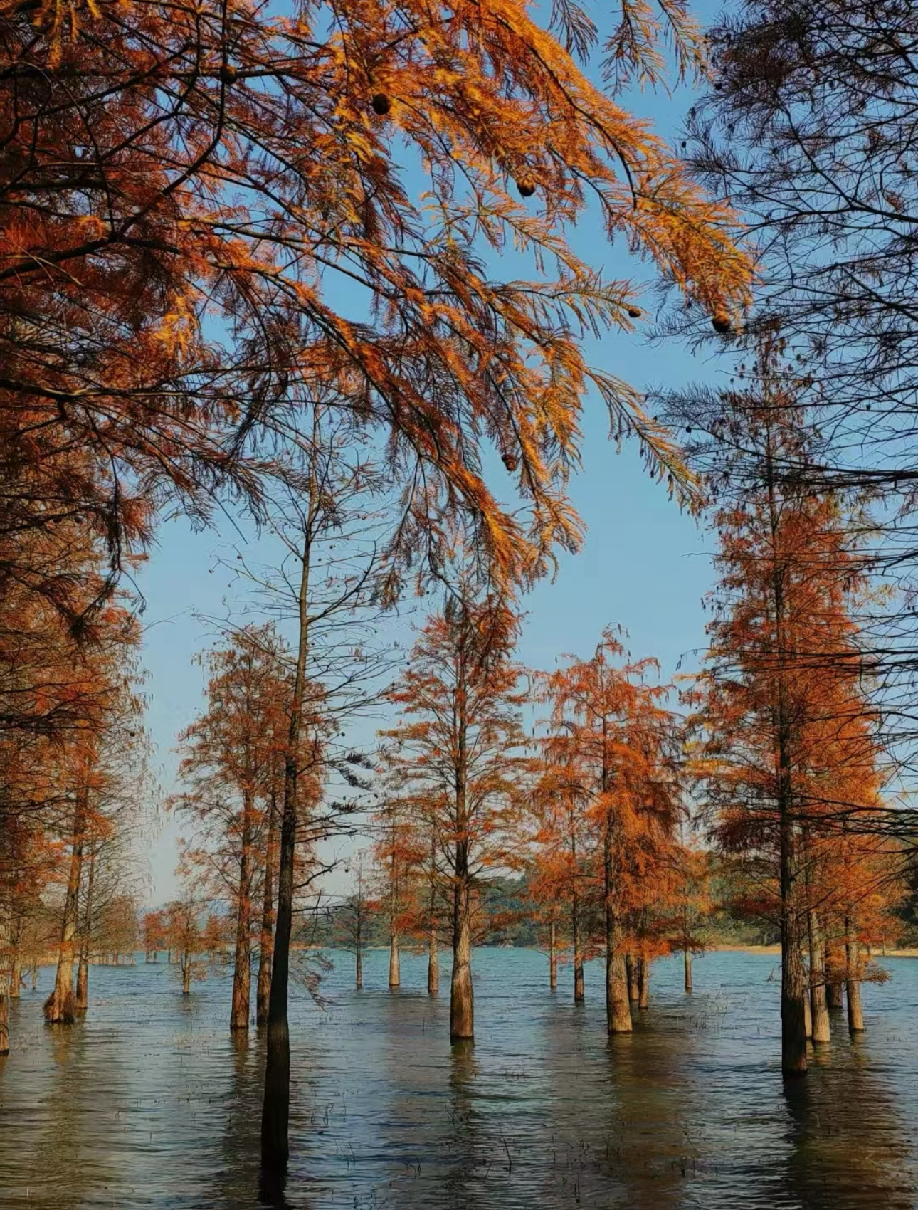 水杉倒影与水中,形成一幅唯美水墨丹青画