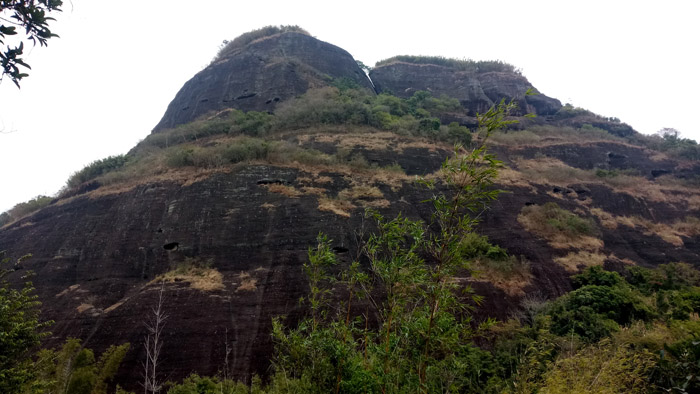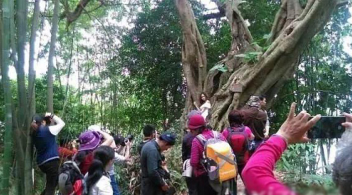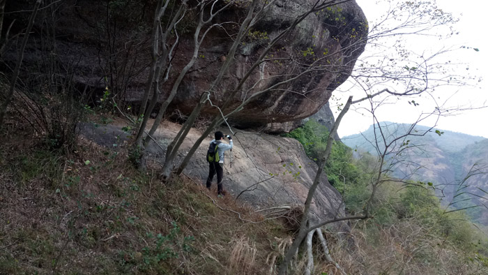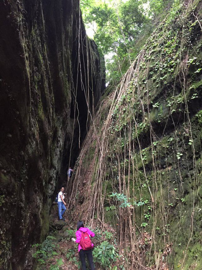 马鞍山上植被保护得很好,有许多山藤,分不清是藤缠树还是树缠藤,藤与树形成的“秋千”随处可见。马鞍山的植物特别之处在于岩石上的树木根系特别发达,根系爬过岩石伸到岩石下的泥土里吸收养分。在布满树根的岩石边拍上一张照片,倒是个很不错的选择。