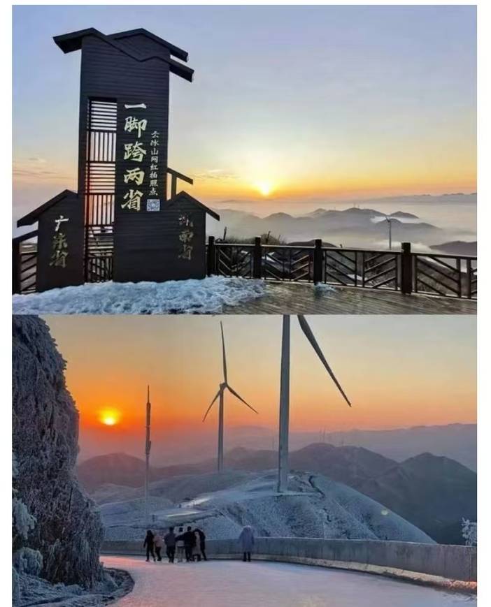 登上山顶,若隐若现的“大风车群”尽收眼底,山上还有上千年的高山野生苔藓,可以打卡一脚踏两省网红观景台(一边是广东,一边是湖南),然后前往铁索桥,并前行至云冰山咖啡屋....