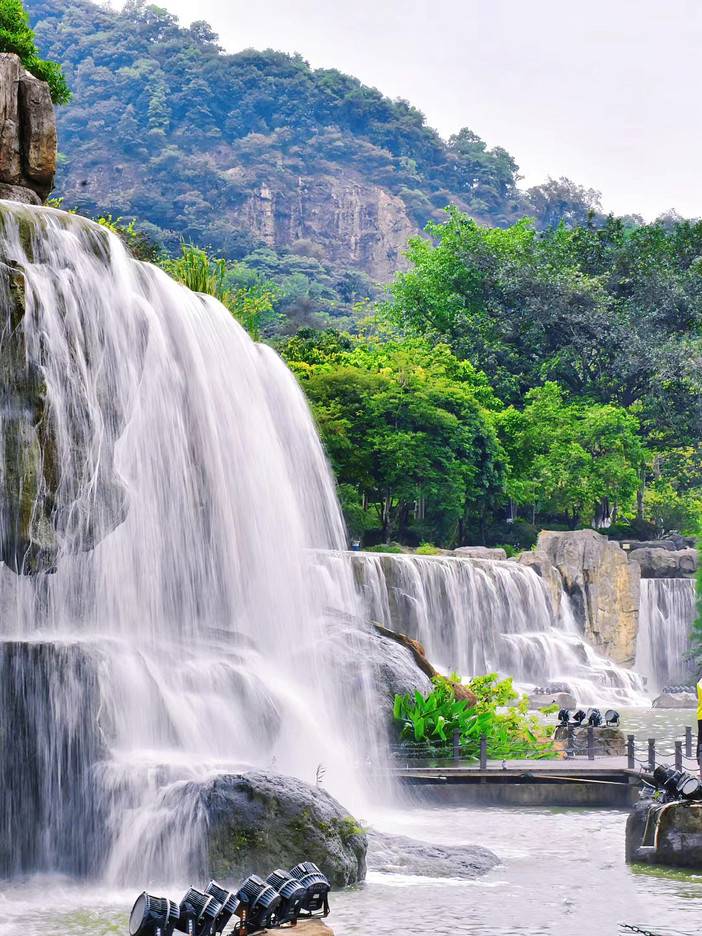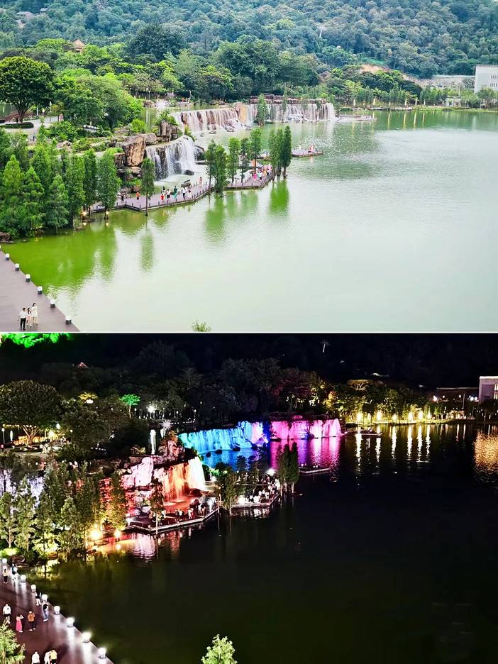 到了晚上,樵山瀑影射灯亮起,顿时成为七彩秘境,站在瀑布顶端,还可饱览整个听音湖