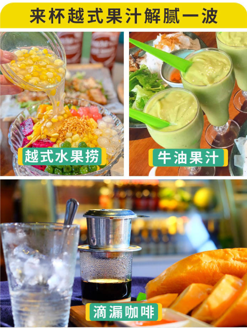了解越南人的生活,农贸市场和咖啡馆是必到之处。市场里的热带水果,价格比国内便宜一半,火龙果更是越南特产。花十几元人民币就能满载而归。腰果和咖啡是游客的必买之物。咖啡馆里,正宗的越南黑咖啡大约6元人民币一杯,用炼乳调味,香味独特,用当地导游的话说,“一闻就知道是不是越南的”。越南人喝咖啡用的滴滴壶,也是极受欢迎的旅游纪念品。