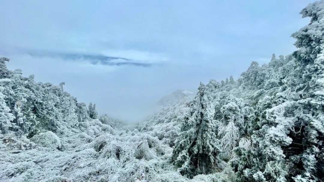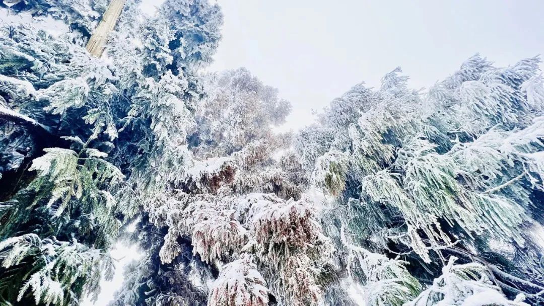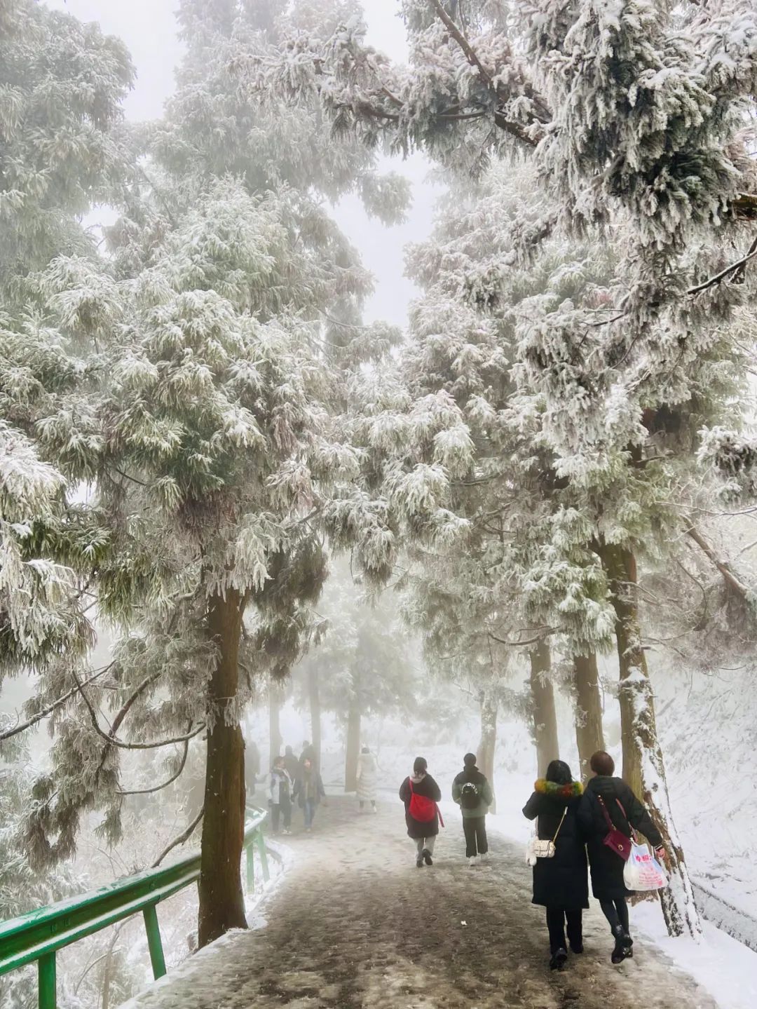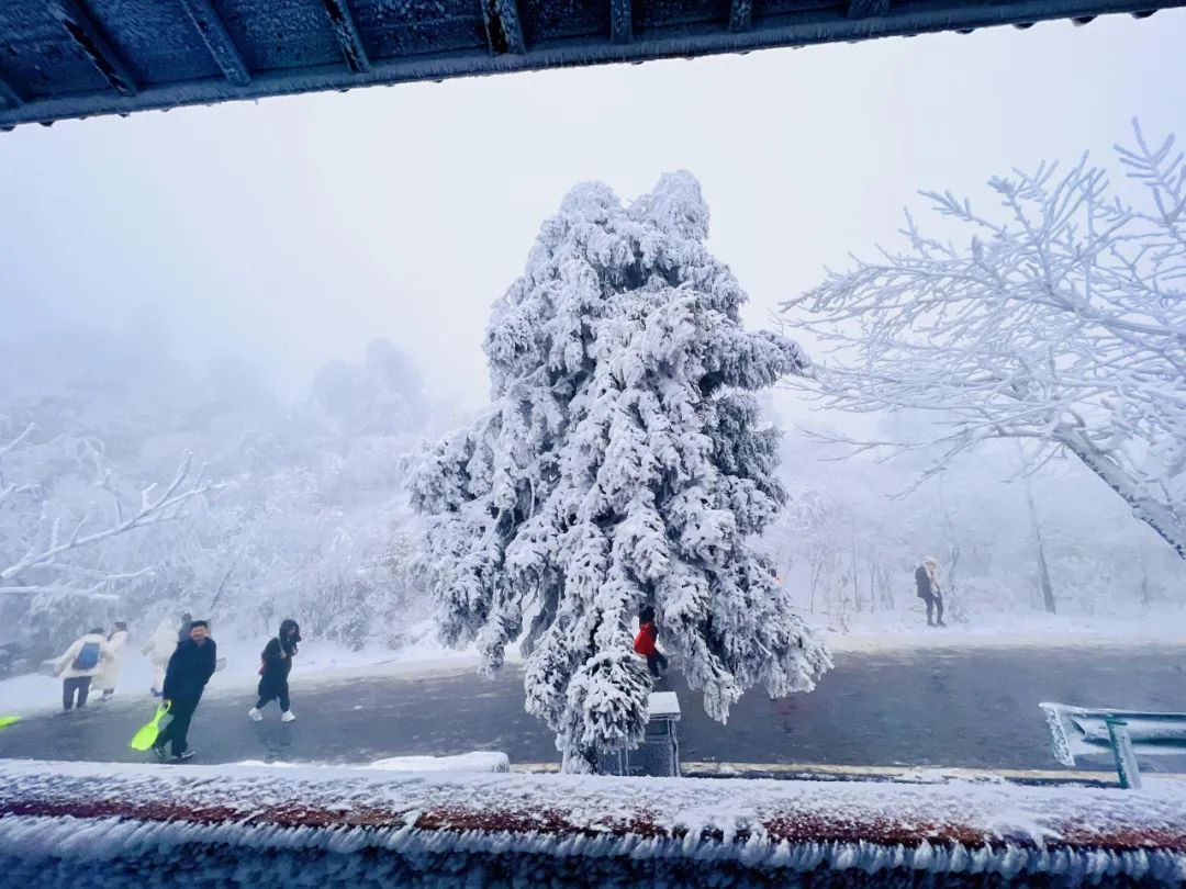 每年冬天,衡山白雪皑皑。清晨霜挂枝头,午后变成片片雪花飘落