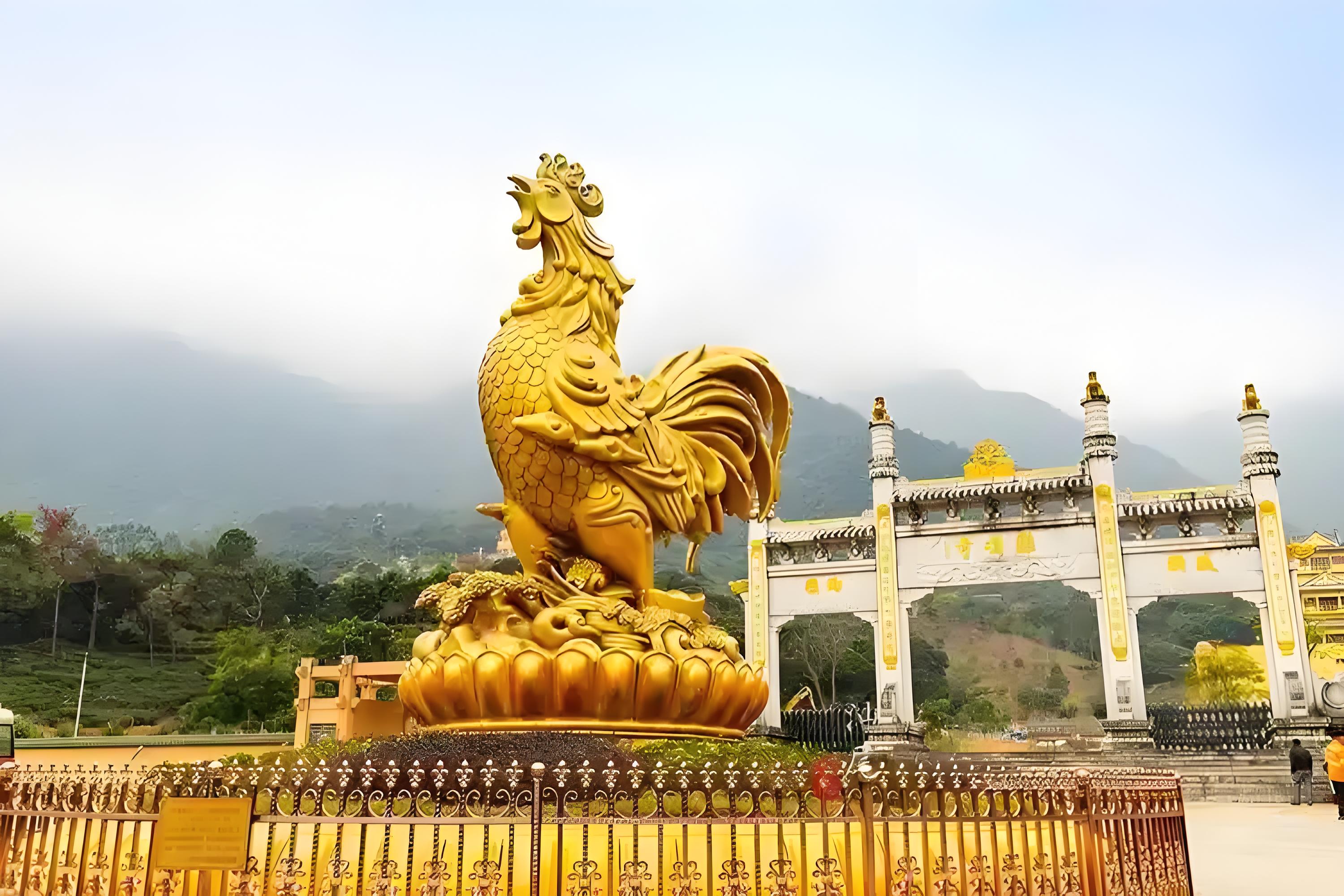 海丰鸡鸣寺,位于广东省汕尾市海丰县北部莲花山森林管理区,距海丰县城13公里,在莲花与银瓶两山环抱的鸡心山上。始建于明崇祯六年(1633年),为高僧印真和尚向合邑缙绅商户募款所创建,原址在寺对面5里之莲花山下,因破晓时慈任常闻鸡心山有公鸡啼鸣,认为灵瑞而迁于今址。寺后群峰叠起,翠秀异常。沿山门踏阶而上,径旁松杉交翠,郁郁葱葱,凉风习习。周围有“如来盘石”、“猕猴奇石”、“犀牛望月”、“玉龙喷须”、“三井回音” 等自然景观;并有开山祖师印真和尚墓塔、明末天然奇石弥勒佛像、东洋古银币等文物古迹;还有生长于山上500多年的长叶竹柏和6.55米仙茶古树、土沉香、巴戟天等国家保护的珍稀树种。故鸡鸣寺自古以来就是人们游览的著名景区。鸡鸣寺历代均有高僧住持。清光绪年间,著名诗人、书法家江逢辰与该寺方丈唯心法师相善,在寺中品尝仙茶“龙头凤尾”之后,赞不绝口;题诗曰:“寄语山僧好持券,每年须寄数斤尝。”莲花山茶遂遐迩闻名。