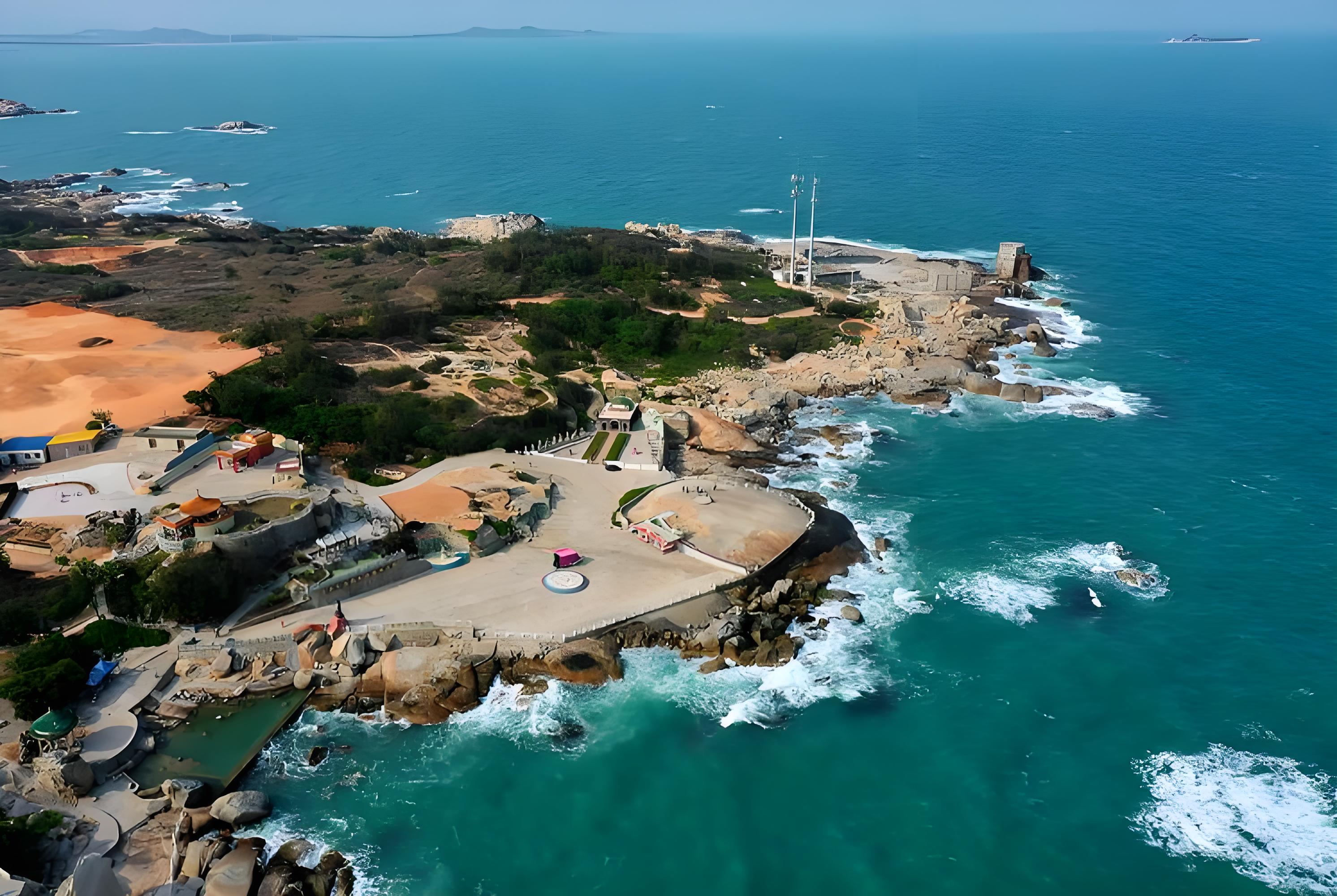 红海湾奇观:寺外礁岩林立,海浪与黑礁石撞击出“遮浪奇观”——东侧惊涛骇浪如千军万马,西侧碧波如镜似世外桃源,一键拍出“冰火两重天”的震撼大片。