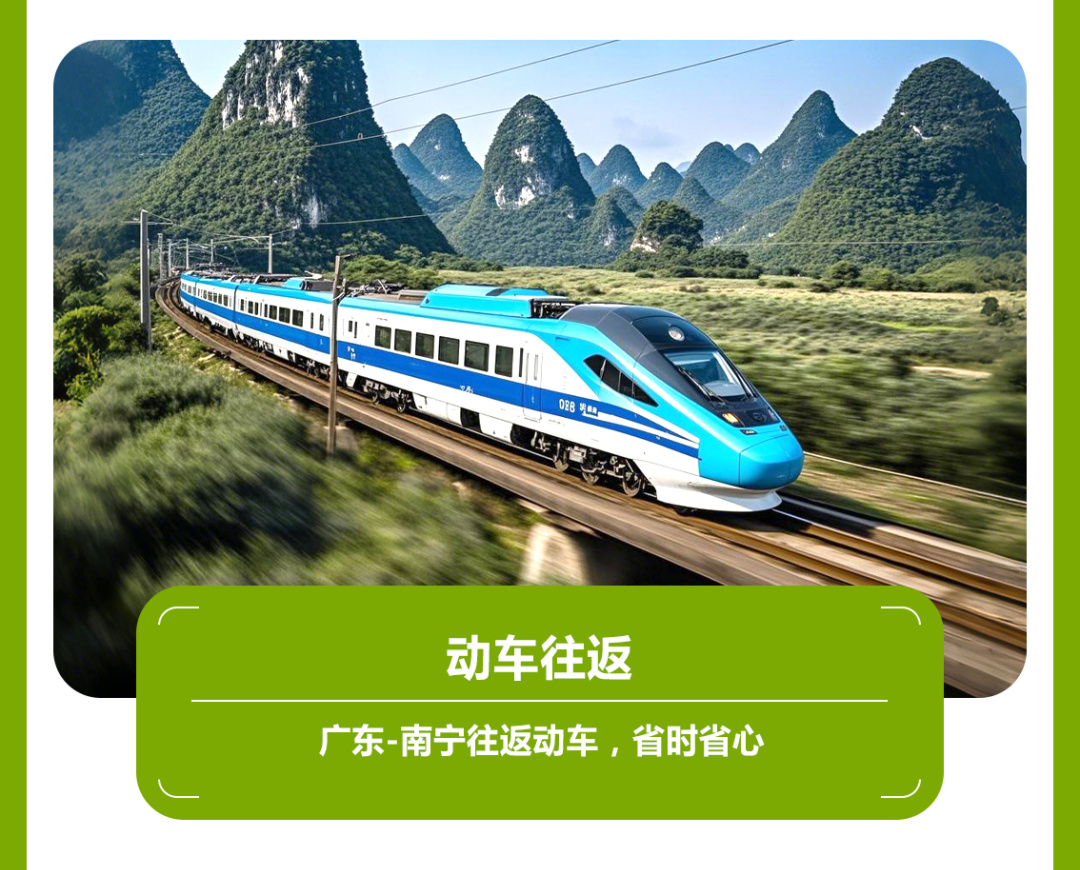 ②广东出发可代出动车票:广州南/深圳/珠海/佛山/肇庆乘动车前往南宁/南宁东站(车程时间约4小时),(如果动车票紧张,会安排到广州南站中转)