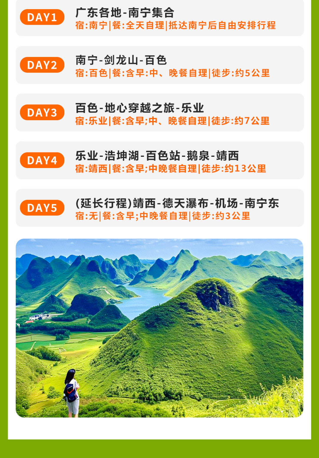 酒店-浩坤湖徒步-百色站4天活动队员解散-5天延长行程队员继续乘车前往鹅泉-靖西(住宿靖西酒店)