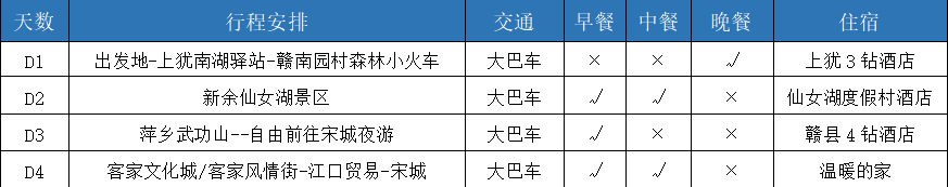 4.住宿:入住上犹酒店1晚3钻+仙女湖酒店1晚+升级一晚四钻酒店,如单男单女须补房差3晚共¥400元/人;