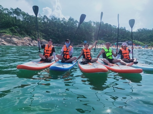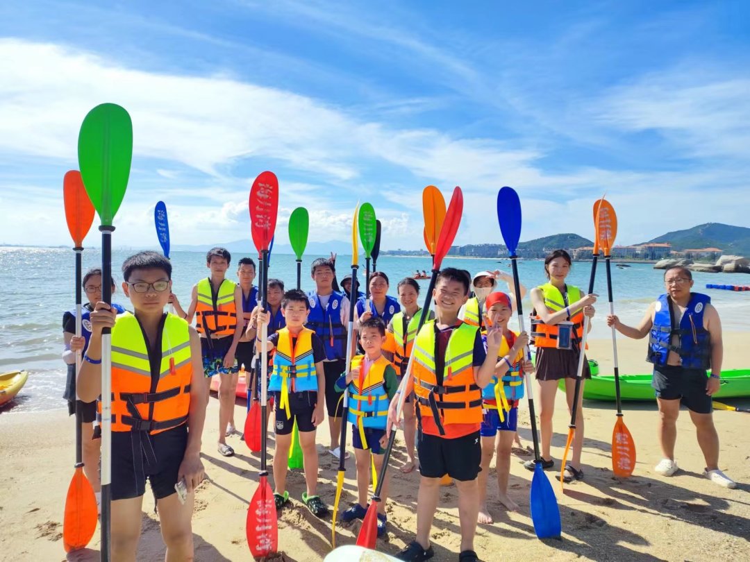 15:00左右体验皮划艇【费用已含】(两人一艇,有教练指导游玩方法,约半小时):包括皮艇和划艇,都是两头尖小没有桨架的船艇。皮艇是桨手坐在艇内,使用一支两端桨叶互成约 90°的桨,在艇的左右轮流划水,游客每两人乘坐一条皮划艇,自由穿梭在碧蓝的大海,多姿的礁石,迷人的海滩构成了动静交融的海滨风光。