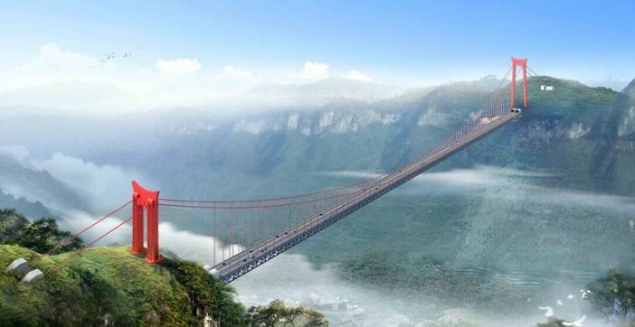 说起德夯的路桥奇观,大家第一联想到的是什么?是不是位于德夯大峡谷上空的“世界第一悬索桥”呢?德夯特大悬索桥是世界上跨越峡谷长度最大的钢铁悬索桥,是杭瑞高速公路上跨越的德夯大峡谷的特大型桥梁,位于矮寨上空335米处,采用71对吊索钢丝绳。跨度达到了1176米,投资10个亿,创造了四个“世界第一”:一是大桥主跨1176米,跨峡谷悬索桥创世界第一;二是首次采用塔、梁完全分离的结构设计方案,创世界第一;三是首次采用岩锚吊索结构,并用碳纤维作为预应力筋材,创世界第一;四是首次采用“轨索滑移法”架设钢桁梁,创世界第一