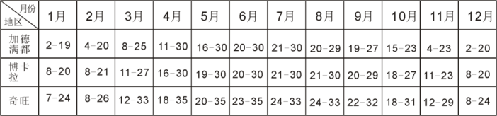 (以上为尼泊尓各地气温表,9月底至次年3 是尼泊尔的干季,气候爽朗。冬季出行时基本上携带薄毛衣及外套就可以。奇特旺属热带,天气炎热,别忘了带短袖衫。要做健行徒步的游客需要根据线路海拔的高低和季节携带适合服装,一般白天行走时可穿T 恤,晚间则需要添加羽绒服。由于日照充沛、冬季气候干燥,建议您准备太阳镜、防晒霜、遮阳帽、润肤、润唇膏等用品。洗漱用品和拖鞋尼泊尔各酒店内基本不提供,强烈建议携带出行)