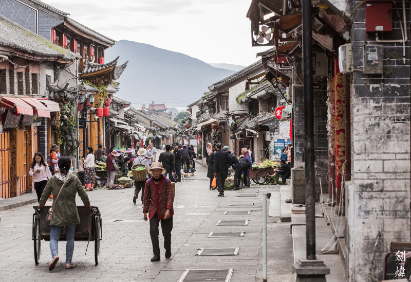 在客栈寄放好行李稍做休整后,准备出去吃早饭,走在人民路上,这是大理古城最热闹的一条街了,早上的大理古城甚是宁静,人民路两边的店铺都还没有开门,路上也见不到几个行人,偶尔能见到的是几个当地的白族百姓背着背篓,还有的推着小推车,背篓里、推车上堆满了新鲜的蔬菜,正赶往集市去卖。也许,这是一天中大理古城最祥和的时刻,我喜欢这样的大理古城,这才是大理古城的本质,暂时告别喧闹,返璞归真。过不了多久,大理古城就会热闹起来,店铺都将开门营业、大量的旅游团将会涌入,整个古城都充斥着叫卖声、锣鼓声和旅游团的喇叭声。继续往前走,我们看到了刚才的白族百姓,他们的蔬菜快卖完了,他们的生活很普通,但他们的生活最真实,他们才是这座古城的主人,维系着古城的那一份淳朴。