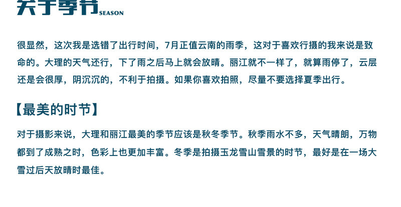 我喜欢用照片来记录旅行中的每一瞬,但这次很不幸,正逢云南的雨季,出片率也大大降低,很多想要拍的景都没有拍到,但没事,这也给了我下次再来的机会。云南是适合多次旅行的地方,这里是少数民族最多的省份,每个民族都有自己的文化和风俗,建筑风格也各有不同,如果你想要一次游完云南,可能要花好几个月吧,这里的每一个地方都是美景,如果你喜欢行摄,这里将是你的天堂。