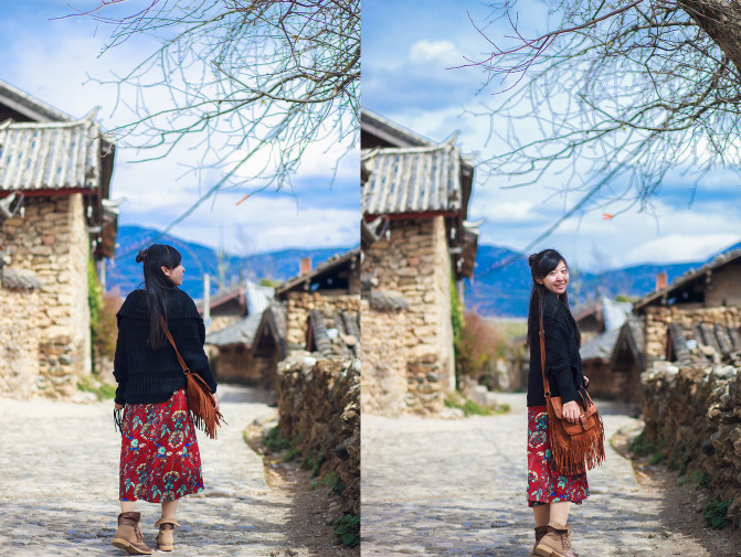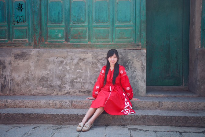 选择在古镇,因为古镇整体色调是深色,所以用大红色来点缀一下,照片会更加出彩。