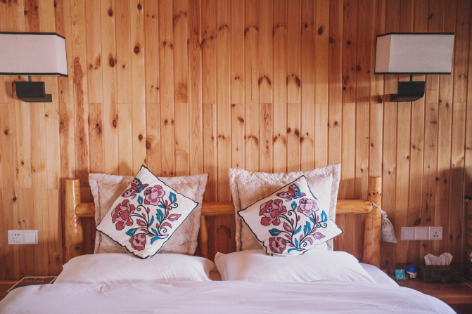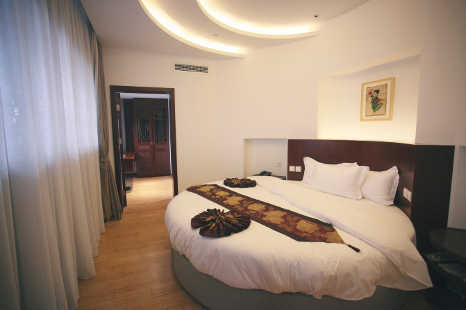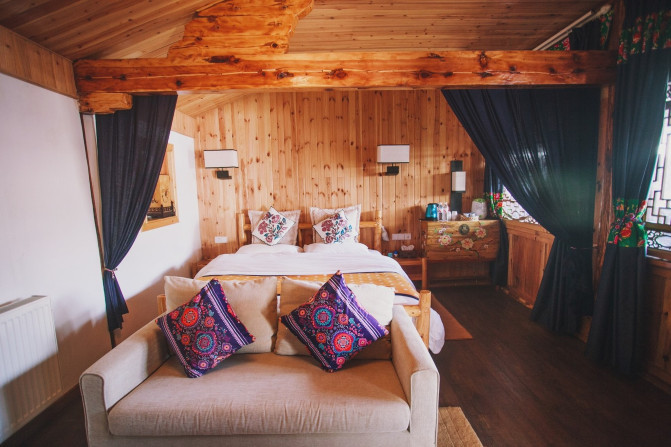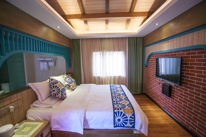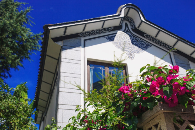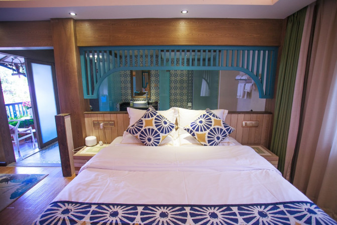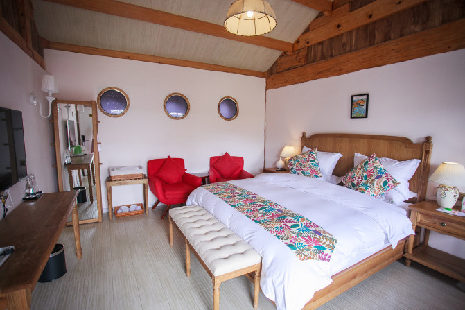 白族风格设计的院落。别墅有三层,房间也比较多,还有茶室,公区也可以露天烧烤。我们晚上在公区烧烤,真是玩得特别开心!我们的别墅总共有6间房。大床、圆床、标间都有。