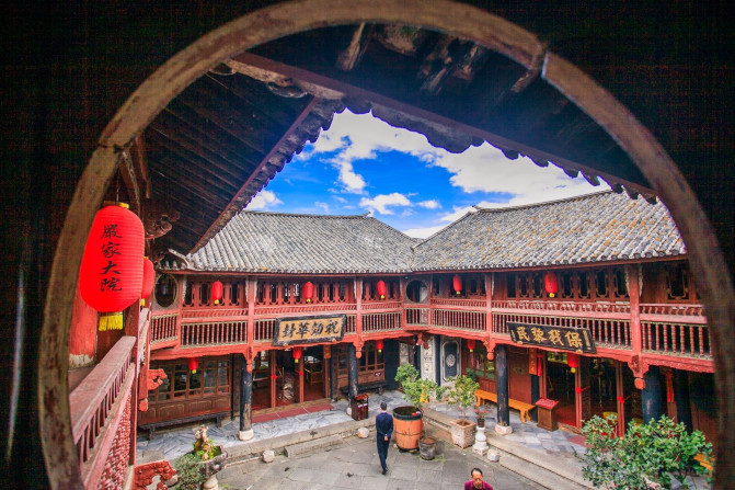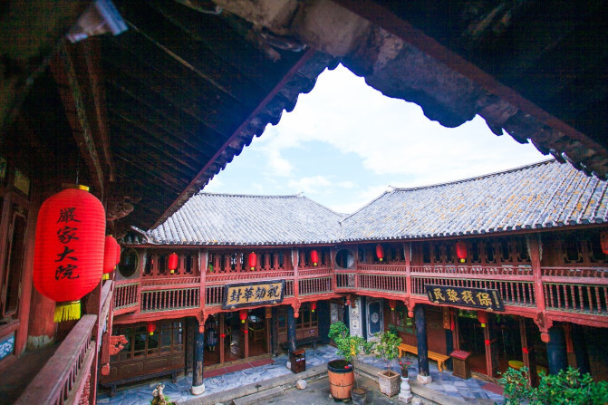 严家大院是喜洲的景点之一。为民国白族富商、喜洲商帮“永昌祥”商号创办人严子珍的宅院,位于四方街西南角的宅院,建于1907年,主体部分用了12年才完工,由4个院落组成,1936年在后院加盖了一幢独立三层西式楼房,占地面积2475平方米。来第三次喜洲了,终于,进来严家大院逛逛,实在是,闲的发慌。。。。
