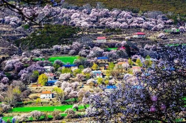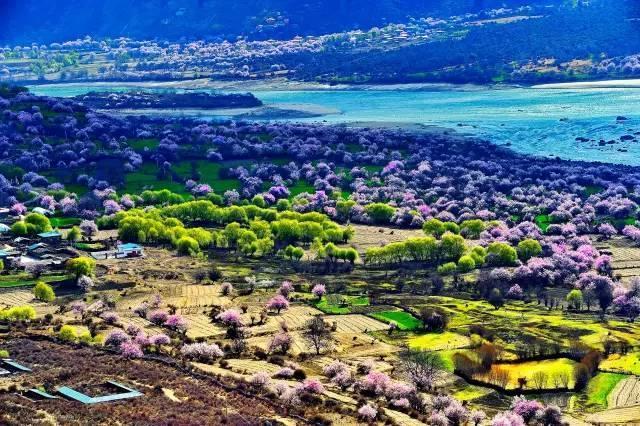 林芝的桃花以壮阔取胜,尼洋河畔的蓝是最好的背景,还有那些星罗棋布的藏式民居,也是花海中最好的点缀。