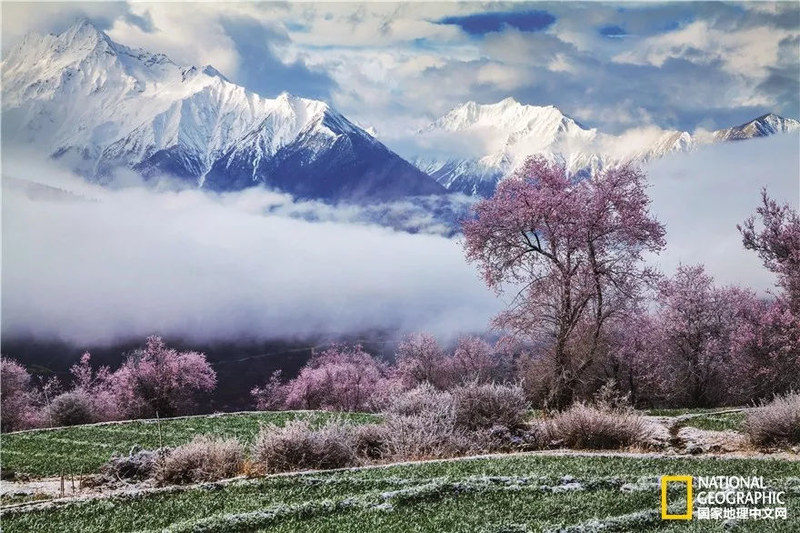 在《中国国家地理》杂志的选美中国特辑里,被誉为"苍穹之矛"的南迦巴瓦峰被评为“中国最美山峰”。顺着雅鲁藏布江而上的暖湿气流形成的云雾常常将它遮住,它也因此被叫做“羞女峰”。灿烂绽放的桃花掩映着美丽的南迦巴瓦峰,让冰冷的雪山也有了丝丝柔情。