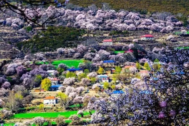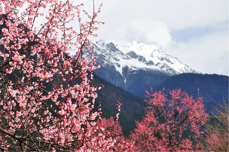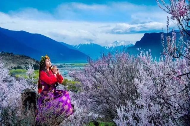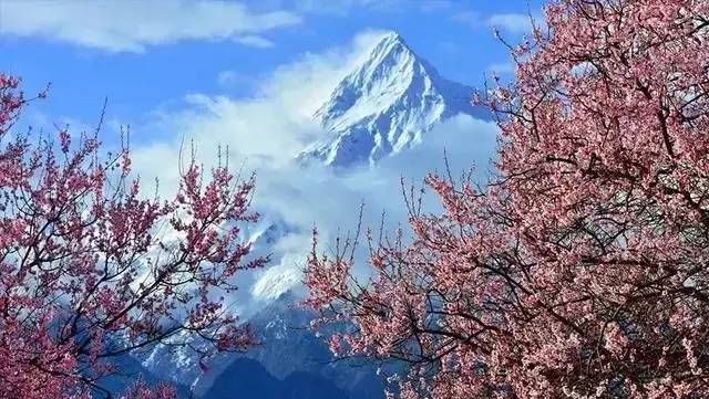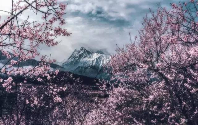 每年那时候,西藏的冬天还未退去,寒意未尽,却已是花的海洋。远方的雪峰还有皑皑白雪,桃花已如醉霞绯云般地争相斗艳。粉嫩的桃花,在气势磅薄的雪山怀抱中无限柔媚。