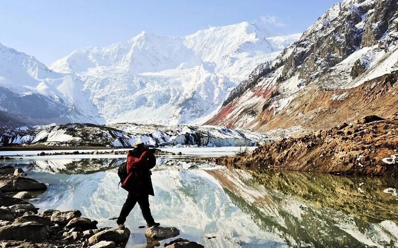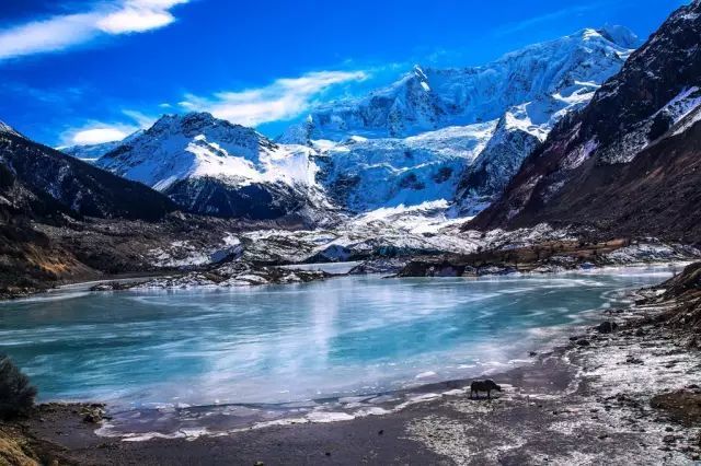 常年雪光闪耀、景色神奇迷人。冰川冰洁如玉,景色秀美,形态各异,姿色醉人。冰川下端是针阔叶混交林地,皑皑白雪终年不化,郁郁森林四季常青,头裹银帕,下着翠裙。
