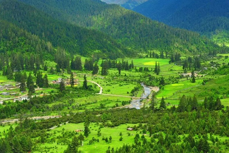 此地风光优美,远处的雪山、冰川,与近处的原始森林、村落、河流交相辉映。周边雪山林立,沟内森林葱笼,林间还有整齐如人工修剪般的草甸,许多民居修建在这山环水复的天上森林,周边溪流蜿蜒,有成千上万种野花竞相开放,简直就是人间天堂。