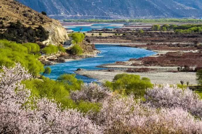 粉嫩的桃花,在气势磅礴的雪山怀抱中无限柔媚。繁花似锦的野桃林,映衬着湛蓝天空;洁白雪峰与碧玉般的尼洋河,美不胜收。如果,就在一年之春,来一场桃花盛宴,那该是怎样少女般的陶醉?