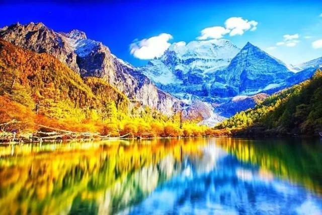 秋天的稻城,就像画家挥动手中的画笔,由满山的绿变为金黄与绿相交,再到金黄的世界,层林尽染。