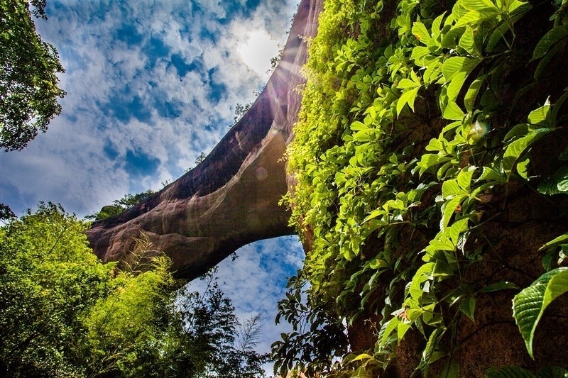 “丹霞第一洞”——黑坦,面积5000平方米;“天下第一门——天生石桥,门高35米,跨度95米,呈拱形,洞口高悬,绝壁临渊,洞中冬暧夏凉,十分幽静,规模之宏大,气势之宏伟,为中国丹霞地貌所罕见,乃飞天山一绝。景区内的鲤鱼寨四周崖壁陡峭,古木苍穹,灌木环绕,秋色丹枫绘出十里廊,美不胜收。更有酷似象征生命之源的圣母岩和阴阳岩,栩栩如生。境内万华岩溶洞全长约9公里。