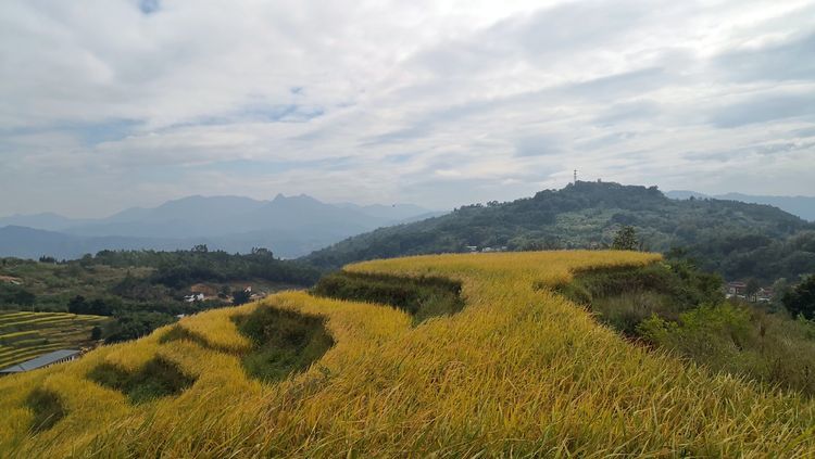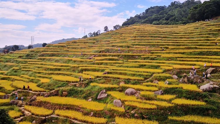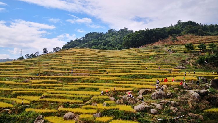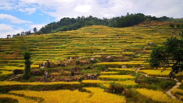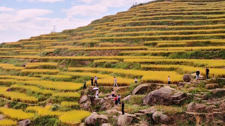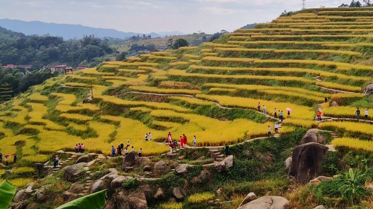 硁二、洋岭梯田虽不是桃花却如世外桃源般让人向往!蜿蜒起伏的山势、错落有序的梯田层次分明、独特的美感,弯弯曲曲的梯田如巧夺天工般变成了一道迷人靓丽的风景线。梯田风景美如画、风吹谷浪稻花香,梯田从山脚盘绕着直至山顶,层层叠叠,高低错落,层层梯田顺势而造、坡面垂直平滑,梯田与梯田之间首尾相连,层层依偎、形状不一,每一层阶梯、每一处梯田,都是独特的风景,美极了!金秋时节,稻谷丰收,成片成片金灿灿的稻田吸引了大家的眼球,金灿灿的稻田就成了广大游客的“打卡景点”。