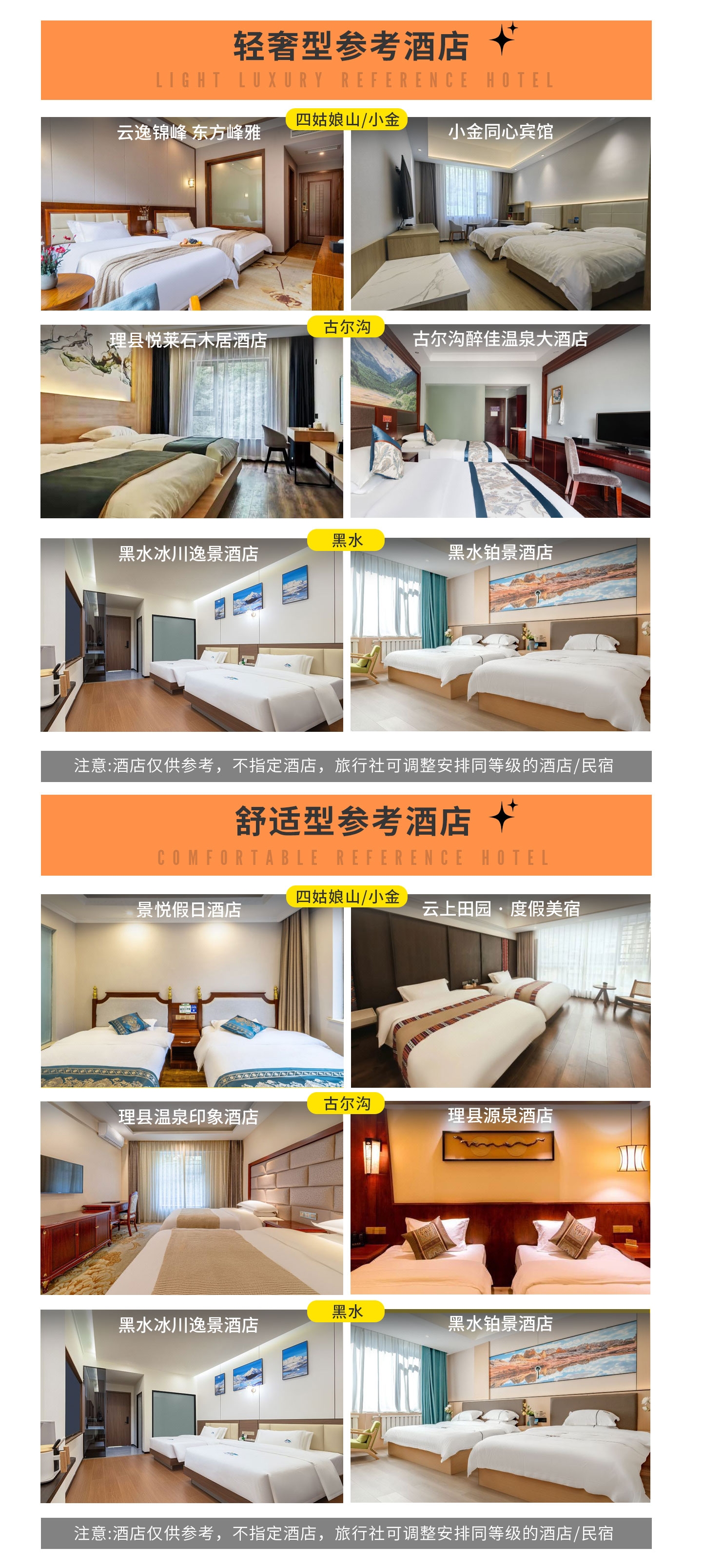舒适/轻奢住宿:黑水冰川逸景酒店、黑水铂景酒店、黑水如意庄园、黑水彩林度假庄园、黑水悦来客栈、黑水神仙居酒店、羊茸哈德民宿、黑水远山拾梦酒店、黑水阿若君豪民宿等同级不接受指定