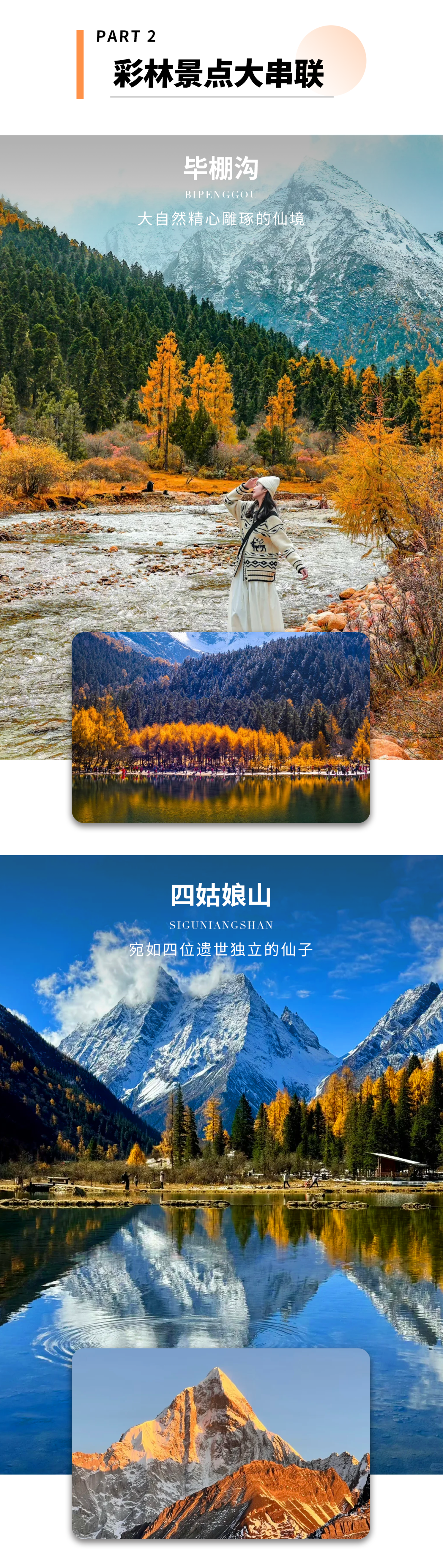 ■ 景区门票观光车自理,参考价格,具体的以实际为准:四姑娘山双桥沟门票80元/人+观光车70元/人;毕棚沟门票+观光车140元/人,毕棚沟电瓶车往返60(可选择消费);卡龙沟门票60元/人,观光车18元/人(暂时未开放观光车,以实际为准)。