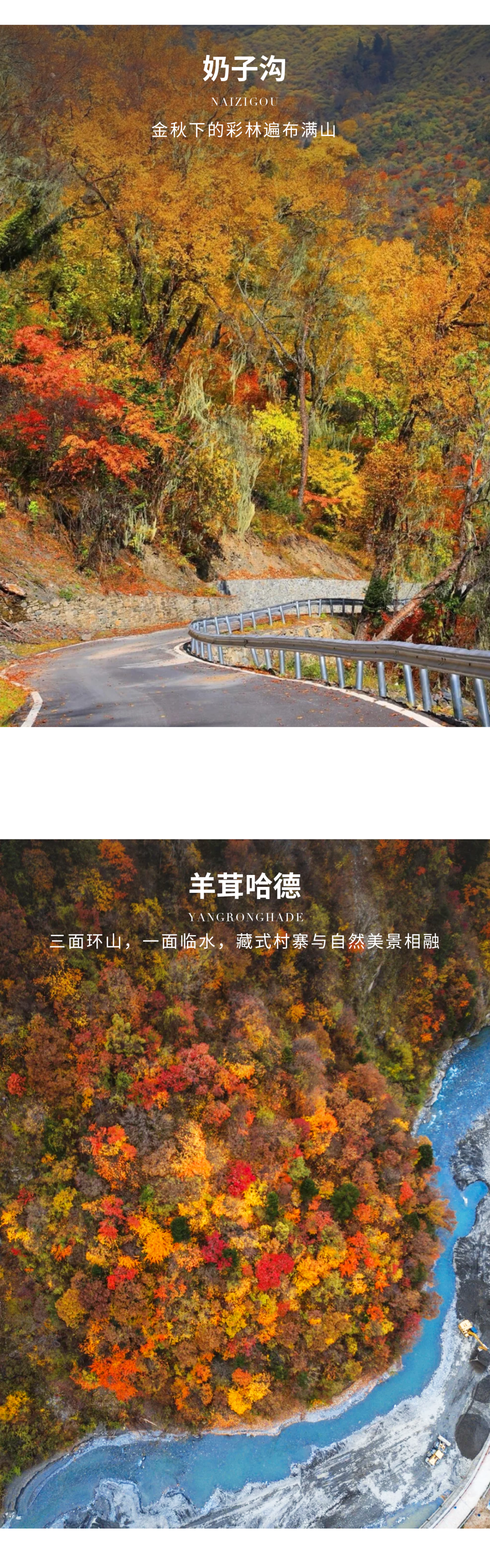 前往奶子沟,每年的10月底和11月初都是黑水奶子沟彩林最美的时候,抓紧这两周的时间去赏川西彩林啦! 黑水奶子沟景区,又名奶子沟彩林公园旅游区、奶子沟彩林公园,位于四川阿坝藏族羌族自治州黑水县至马尔康的要道之间,与红原大草原相连。“奶子沟”在藏语中是美丽富饶、幸福安宁之意。是我国目前开发并已开放的面积最大、景观最壮观的红叶景区之一,享有八十里画廊的美誉。 黑水奶子沟彩林分布在国道两边的山上。晚上入住羊茸哈德村/黑水,办理入住后,可漫步藏式村落,拍摄村落夕阳。
