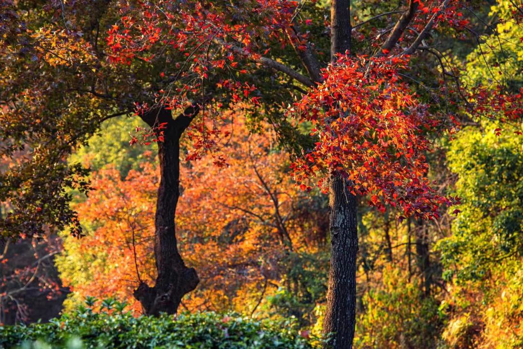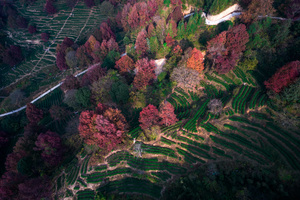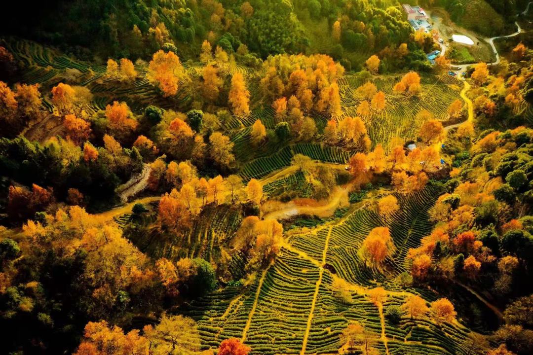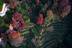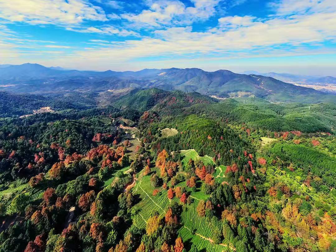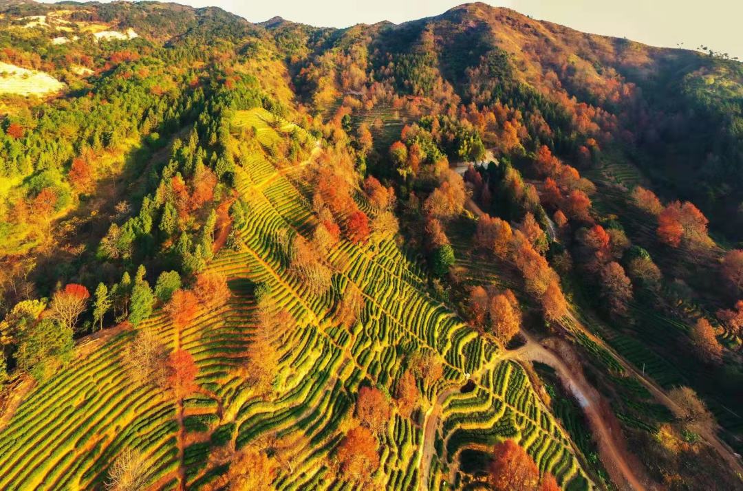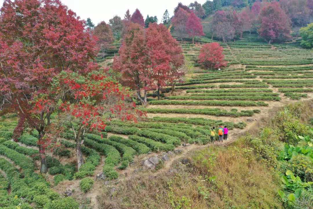 红枫错落于茶田,红绿相间