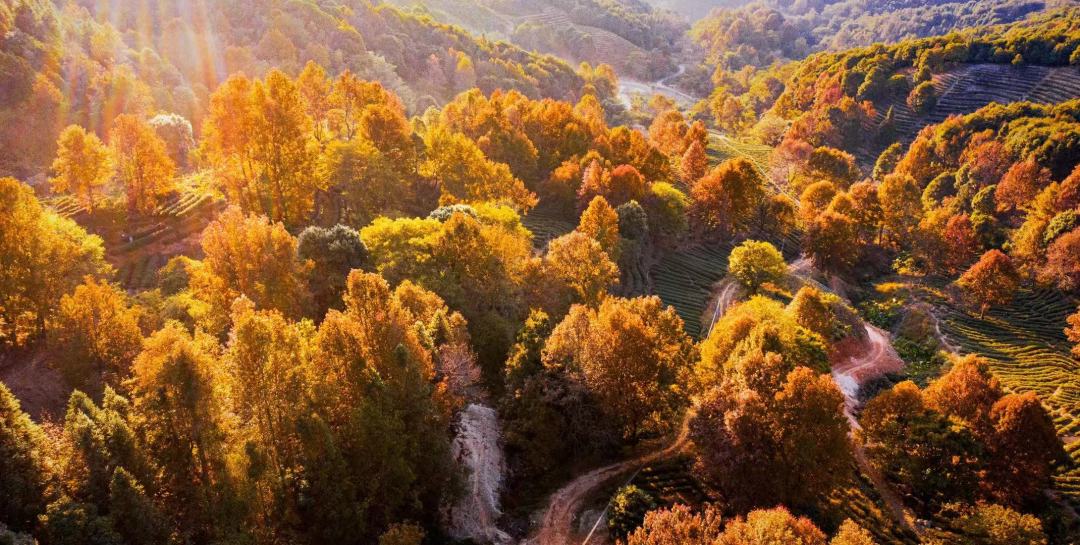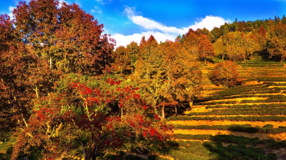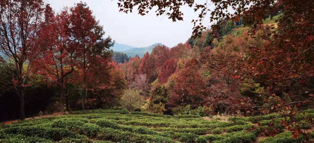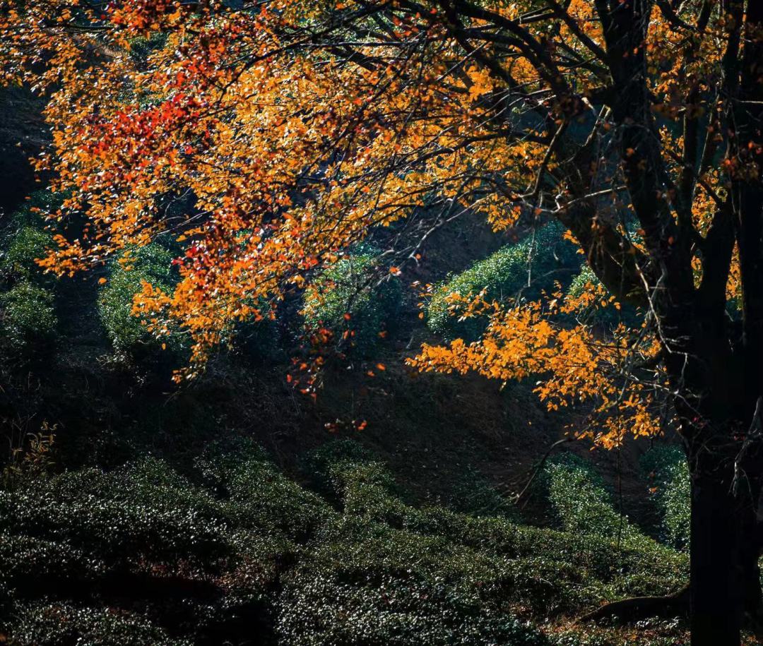 上百颗枫树点缀在半山茶园之间
