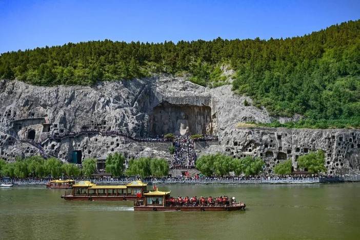 游览结束后,乘车赴十三朝古都洛阳(车程2小时)游览【龙门石窟】(游约2.5小时、景点内观光车20元/人现场自理)参观潜溪寺、宾阳三洞、万佛洞、莲花洞,奉先寺卢舍那大佛等,感受中国佛教艺术的魅力。龙门石窟是中国石刻艺术宝库之一,现为世界文化遗产、全国重点文物保护单位、国家AAAAA级旅游景区,位于河南省洛阳市洛龙区伊河两岸的龙门山与香山上。龙门石窟与莫高窟、云冈石窟、麦积山石窟并称中国四大石窟。
