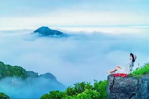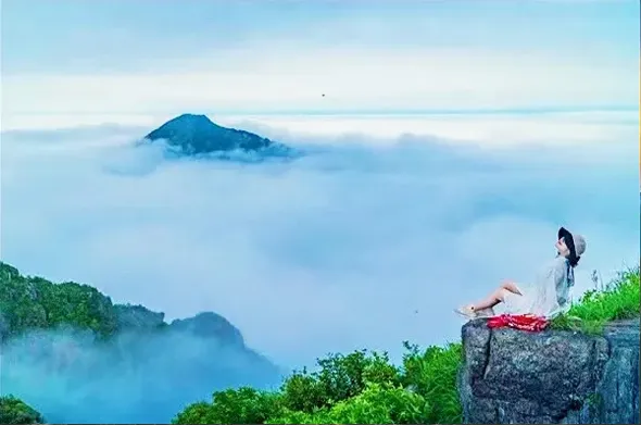 一个小时后到达‘清远第一天梯’的999级爱情天梯上升口,这段长500多米、阶梯2000多级、坡度80度,几乎垂直悬挂在山上的天梯前。走过天梯,就到了通天楼门,经过通天楼门就到了仙境。一座丹石绵砌的通天楼门魏然屹立,紫气腾升,彩霞满天,流光溢彩。一只凤凰停落在天门的石柱上,依恋着这美丽的仙境留连忘返,久久不肯离去,一停就是几千年。再往上攀登一段,就到山顶,山顶如同天宫,四处云雾缥缈,三大主峰高耸入云,气势磅礴。云雾飘过后,雄伟壮观的悬崖峭壁就在脚下。