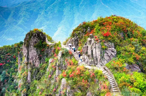 09:00 到达山脚停车场,大家稍作准备,热身后开始攀登广东第八峰金子山,登山道基本是楼梯,要控制好速度、调整好呼吸、调整心态。每年四五月份 金子山满山的杜鹃花,站在天梯往两边看,可见满山满谷,红色、粉色、紫色、白色的杜鹃花此起彼伏、尽相开放。