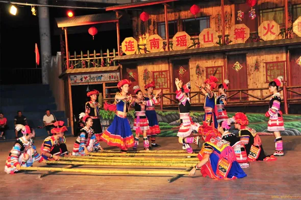 晚餐后参加连南的瑶族篝火晚会,数名漂亮的沙腰妹(即未婚女青年)唱着热情洋溢的瑶歌,几位瑶族阿贵(即男青年)腰挎长鼓,跳起了长鼓舞。大家尽情地与瑶族青年男女载歌载舞,参与竹杆舞、“娶”一个沙腰妹为“妻”等活动(人够,时间来得及才可以哦),然后入住酒店休息。