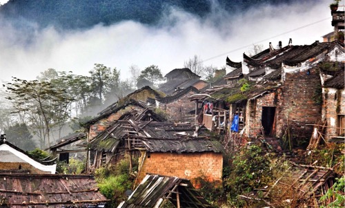 15: 00 左右油岭瑶寨停车场,由于油岭瑶寨尚未开发,比较原生态,路比较窄小,大巴不能开进去,需要徒步半个小时左右到寨里,然后开始摄影拍照(山下瑶寨房屋多是青砖木瓦、底层用石头砌成,木桩加固支撑顶层。二层外面,木头和栅栏围起来一个小院,摆上石桌石凳,闲来聊天。寨子内石板巷道纵横交错,将家家户户连接起来。