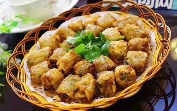 【潮州春饼】是广潮汕地区传统小吃的佳品,又名潮州春卷。节日食俗。它呈长方形,金黄美观,外酥里嫩,味浓香郁,为人称道。皮酥脆,馅咸香。